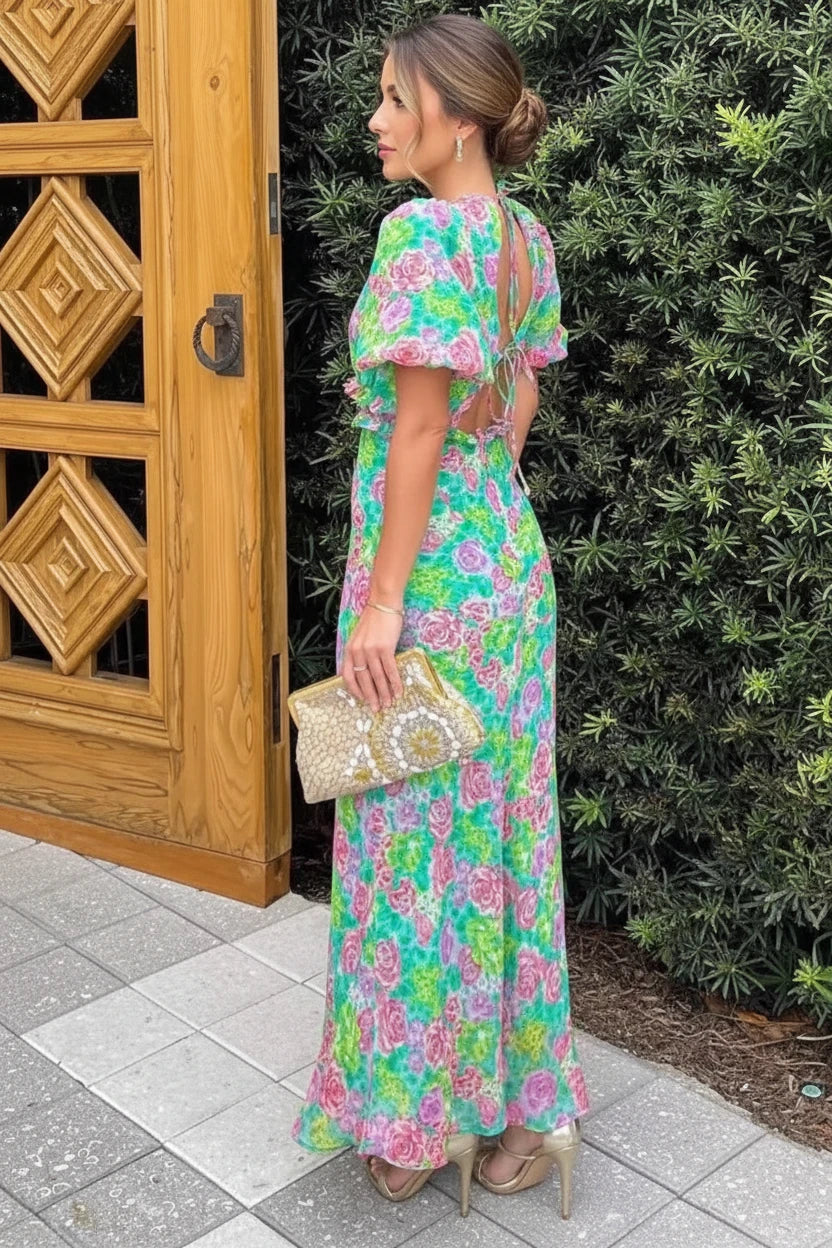 Floral Print V-Neck Puff Sleeve Midi Dress