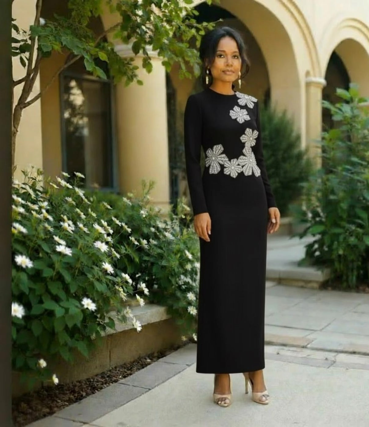 Black L/S Flower Embellished Maxi Dress