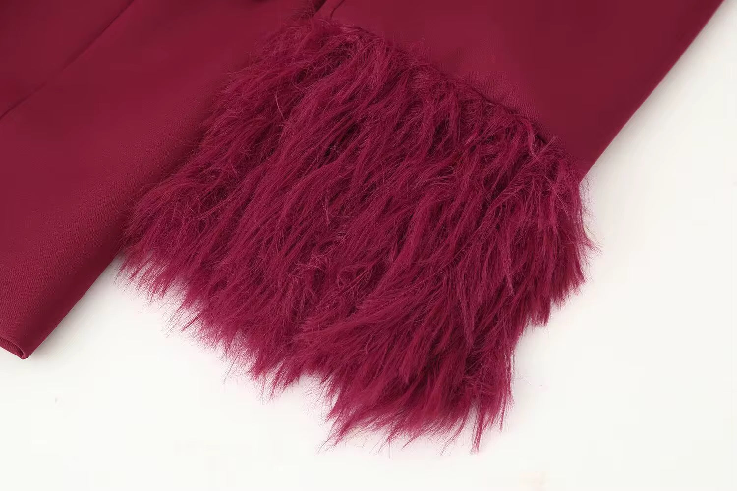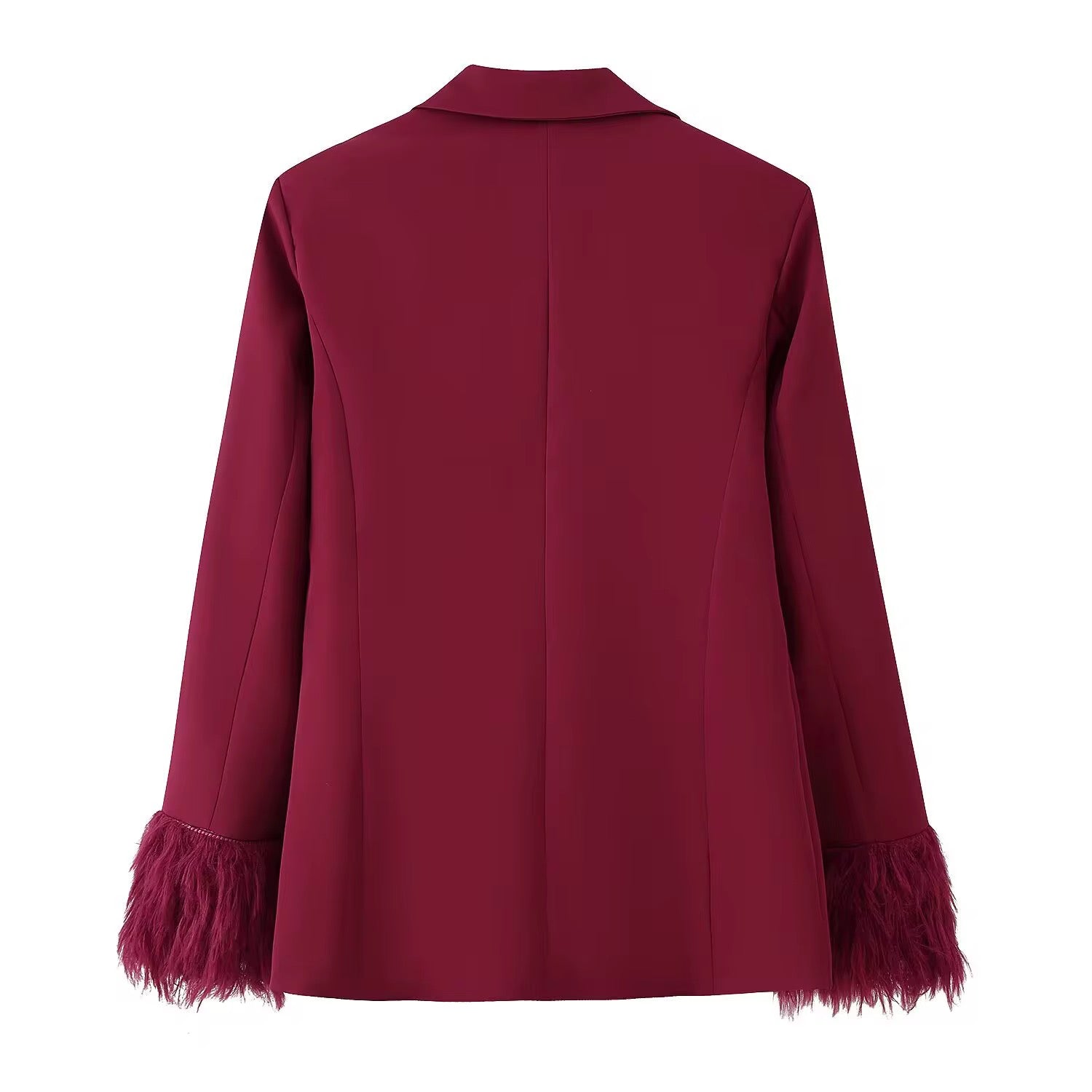 Make a bold style statement with this burgundy blazer, featuring a unique feather trim on the sleeves of the blazer for an added touch of glamour. Perfect for both professional and semi-formal occasions, this jacket offers both elegance and comfort.