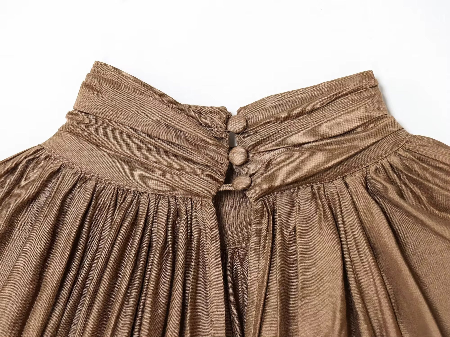 Elevate your wardrobe with this Gold Satin Mock-Neck Blouse, a sophisticated piece that blends fluid movement with polished structure. Featuring a soft, luminous satin finish, this blouse flows effortlessly with gathered detailing along the neckline and voluminous sleeves for a refined, modern silhouette.High mock neckline with gathered ruching
