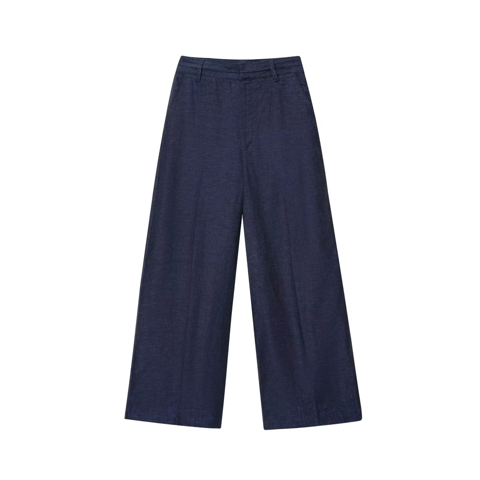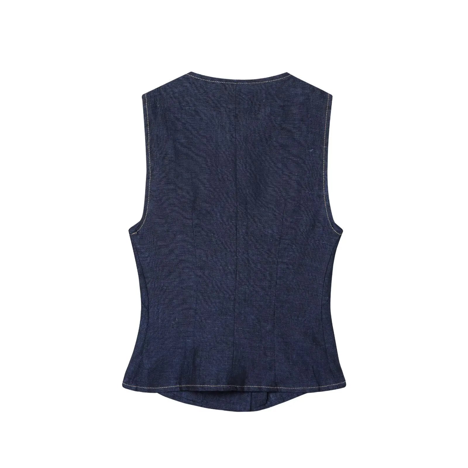 This European-inspired ensemble features a chic round-neck denim vest with a single button closure, paired with wide-leg pants for effortless comfort and style. Crafted from pure color fabric and accented with delicate beadwork, this set blends casual streetwear with refined elegance, perfect for a confident, fashion-forward look.