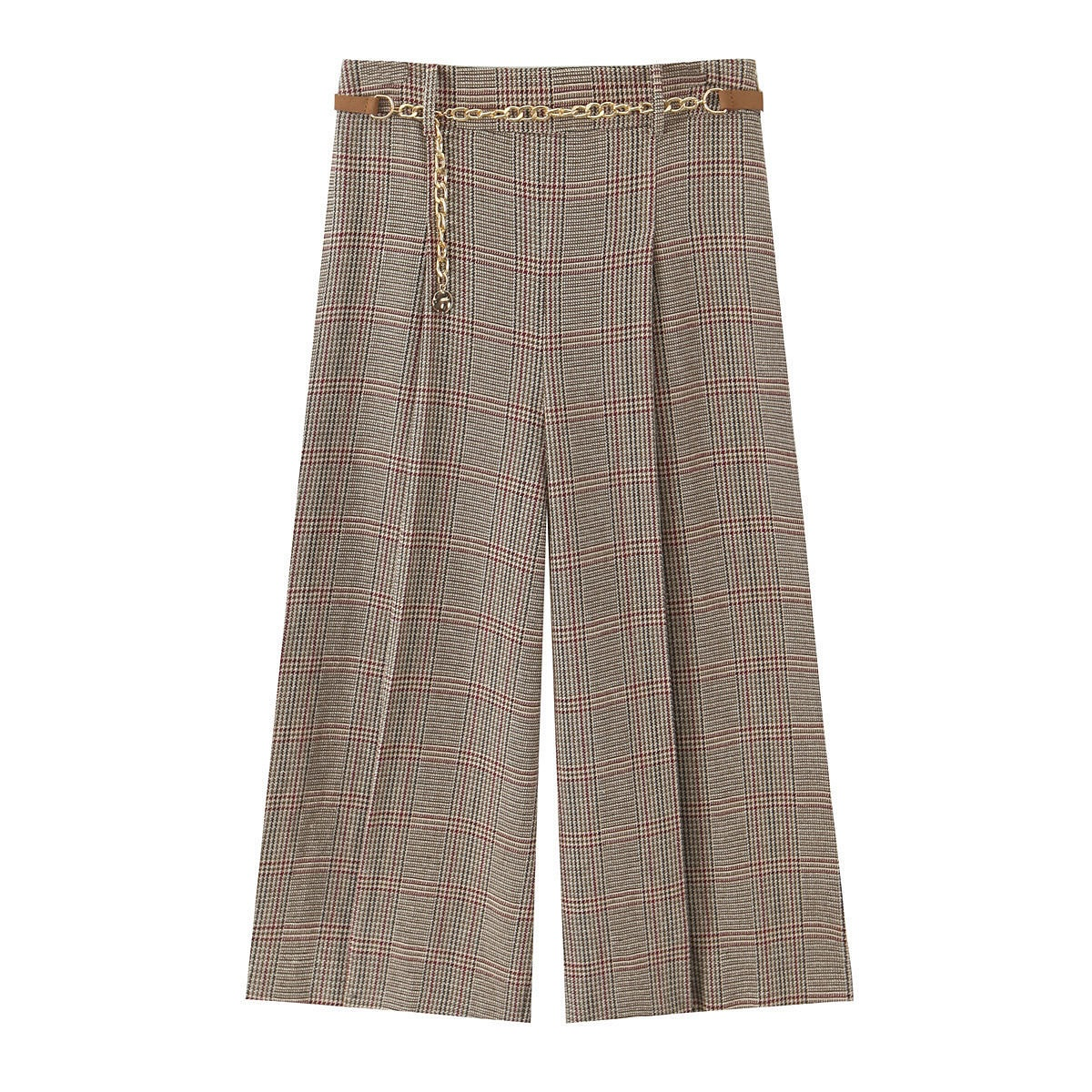 Design: Cropped blazer with collar and button front; wide-leg pants with a chain-link belt.